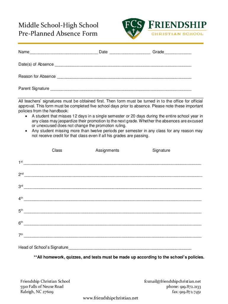 Middle Schooling School PrePlanned Absence Form Name Date Grade Date(s) of Absence Reason for Absence Parent Signature All teachers signatures must be obtained first. Then form must be turned in to