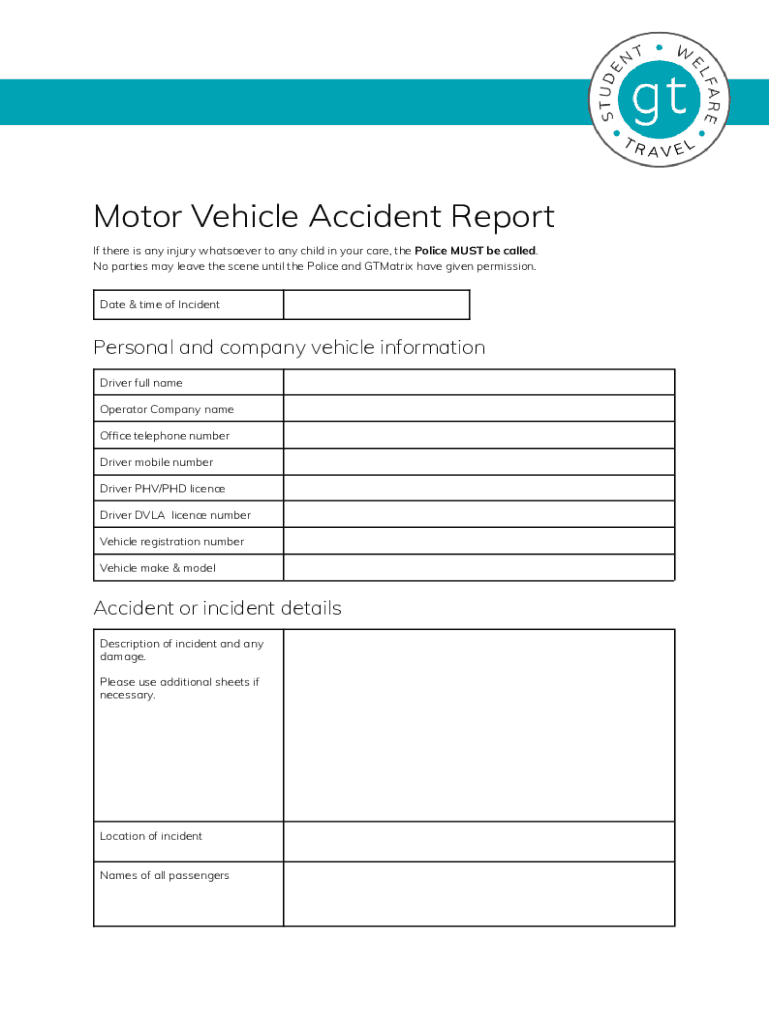 Motor Vehicle Accident Report If there is any injury whatsoever to any child in your care, the Police MUST be called. No parties may leave the scene until the Police and Matrix have given permission.