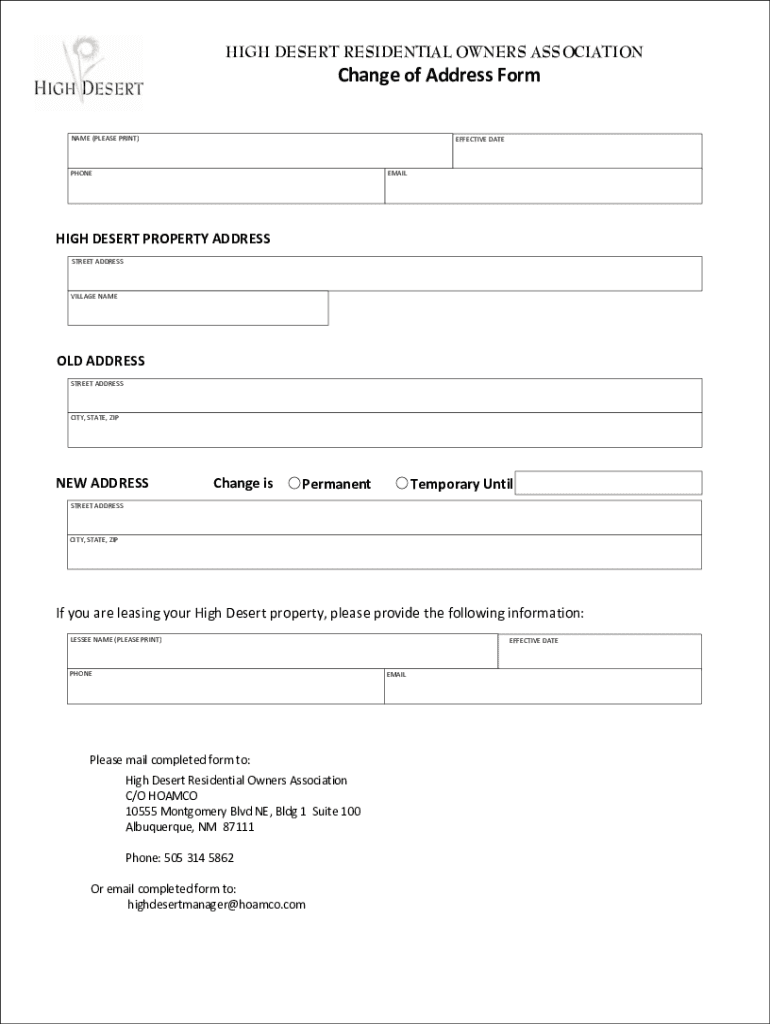 HIGH DESERT RESIDENTIAL OWNERS ASSOCIATIONChange of Address Form NAME (PLEASE PRINT)EFFECTIVE DATEPHONEEMAILHIGH DESERT PROPERTY ADDRESS STREET ADDRESSVILLAGE NAMED ADDRESS STREET ADDRESSING, STATE,