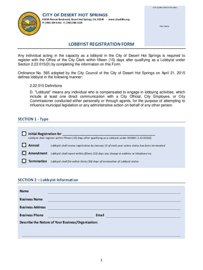 CITY CLERKS OFFICE USE VELOCITY OF DESERT HOT SPRINGS65950 Pierson Boulevard, Desert Hot Springs, CA, 92240 www.cityofdhs.org P: (760) 3296411 F: (760) 2883129 Date StampLOBBYIST REGISTRATION Forrest
