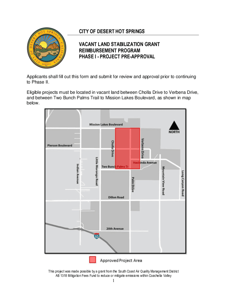 CITY OF DESERT HOT SPRINGS VACANT LAND STABILIZATION GRANT REIMBURSEMENT PROGRAM PHASE I PROJECT PREAPPROVALApplicants shall fill out this form and submit for review and approval prior to continuing
