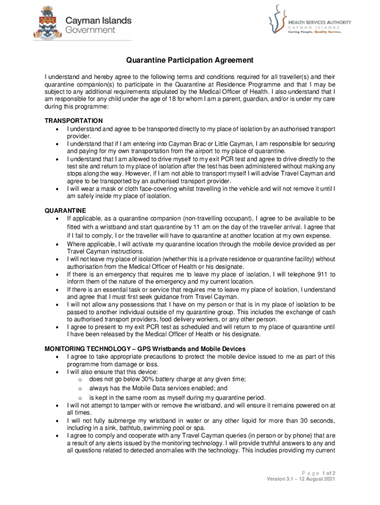 Quarantine Participation Agreement I understand and hereby agree to the following terms and conditions required for all traveler(s) and their quarantine companion(s) to participate in the Quarantine