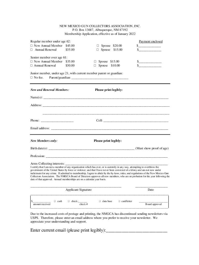 NEW MEXICO GUN COLLECTORS ASSOCIATION, INC. P.O. Box 13687, Albuquerque, NM 87192 Membership Application, effective as of January 2022 Regular member under age 62: New Annual Member $45.00 Annual