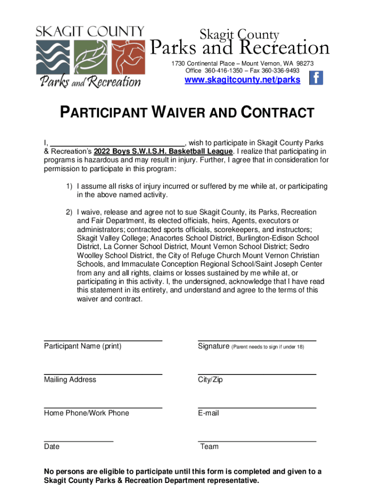 Skagit County Parks and Recreation 1730 Continental Place Mount Vernon, WA 98273 Office 3604161350 Fax 3603369493www.skagitcounty.net/parksPARTICIPANT WAIVER AND CONTRACT I, wish to participate in