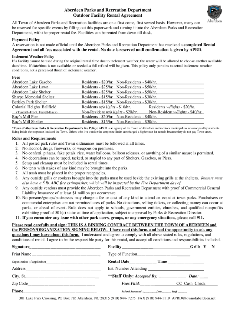 Aberdeen Parks and Recreation Department Outdoor Facility Rental Agreement All Town of Aberdeen Parks and Recreation facilities are on a first come, first served basis. However, many can be reserved