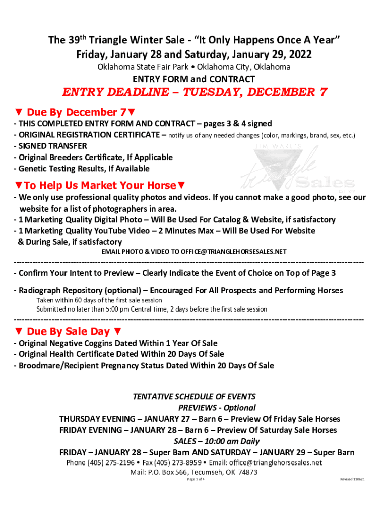 The 39th Triangle Winter Sale It Only Happens Once A Year Friday, January 28 and Saturday, January 29, 2022, Oklahoma State Fair Park Oklahoma City, OklahomaENTRY FORM and CONTRACTIONARY DEADLINE