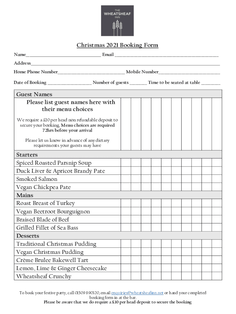 Christmas 2021 Booking Form Name Email Address Home Phone Number Mobile Number Date of Booking Number of guests Time to be seated at table Guest Names Please list guest names here with their menu