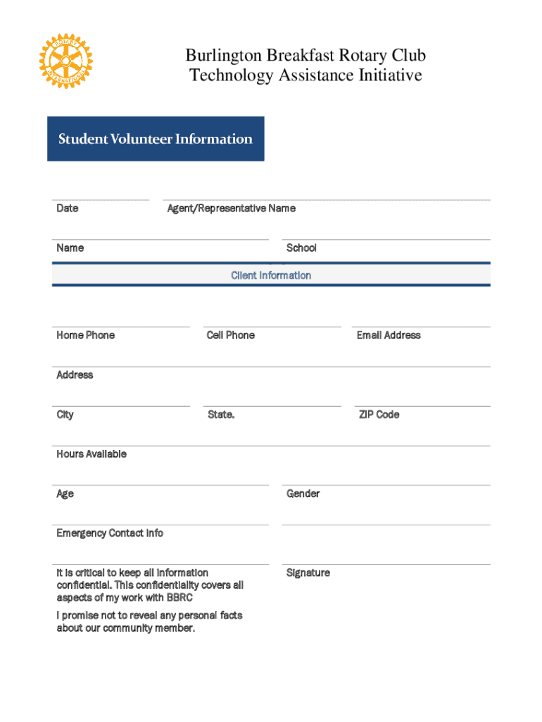 Burlington Breakfast Rotary Club Technology Assistance Initiative Student Volunteer InformationDateAgent/Representative NameNameSchool Client InformationHome Photocell Phonemic AddressState.ZIP CodeAddressCity