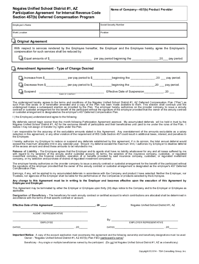 Nogales Unified School District #1, AZ Participation Agreement for Internal Revenue Code Section 457(b) Deferred Compensation Programmed of Company457(b) Product ProviderEmployees Asocial Security