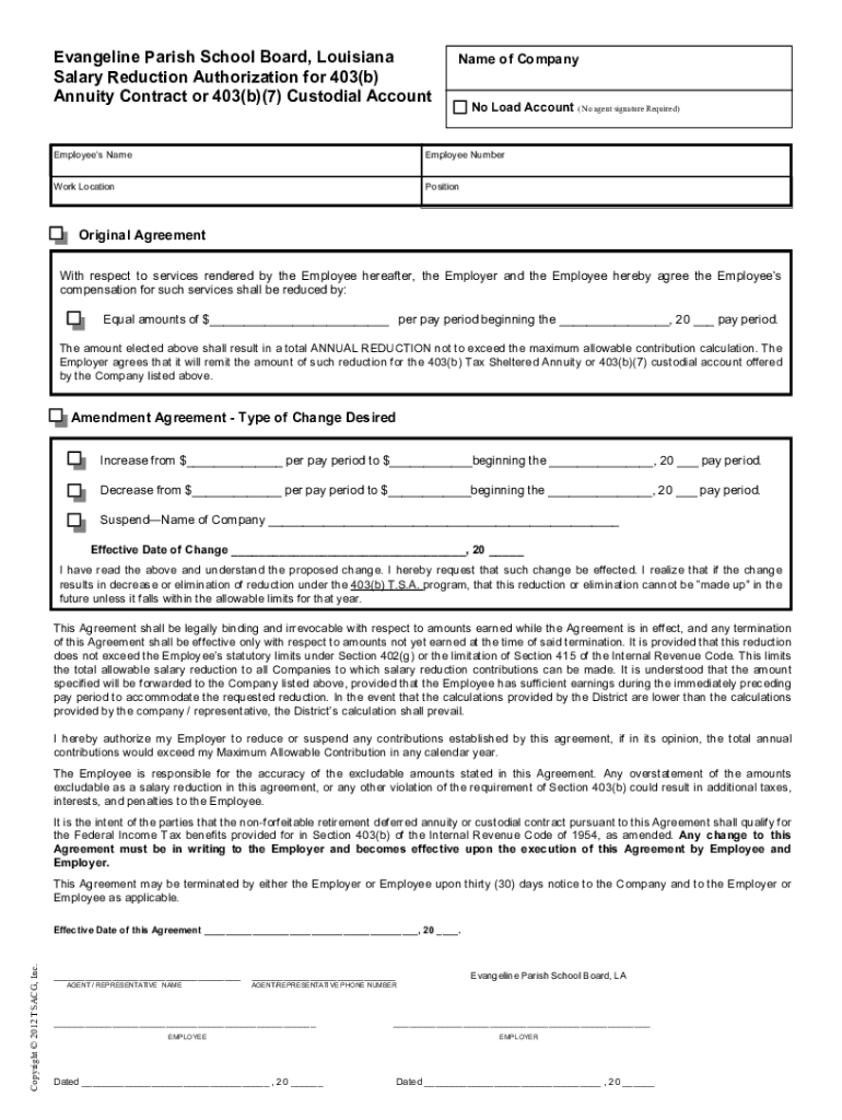 Evangeline Parish School Board, Louisiana Salary Reduction Authorization for 403(b) Annuity Contract or 403(b)(7) Custodial Accountable of Company No Load Account (No agent signature Required)Employees