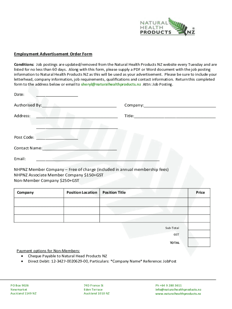 Employment Advertisement Order Form Conditions: Job postings are updated/removed from the Natural Health Products NZ website every Tuesday and are listed for no less than 60 days. Along with this
