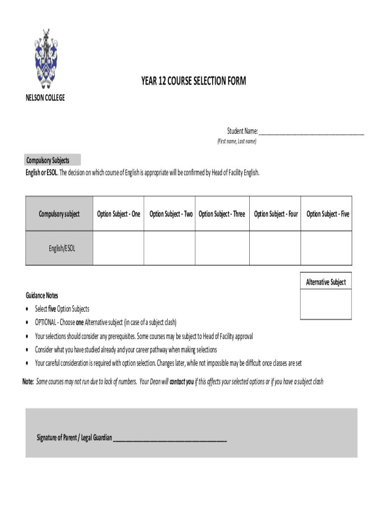 YEAR 12 COURSE SELECTION FORM NELSON COLLEGE Student Name: (First name, Last name)Compulsory Subjects English or ESOL. The decision on which course of English is appropriate will be confirmed by Head