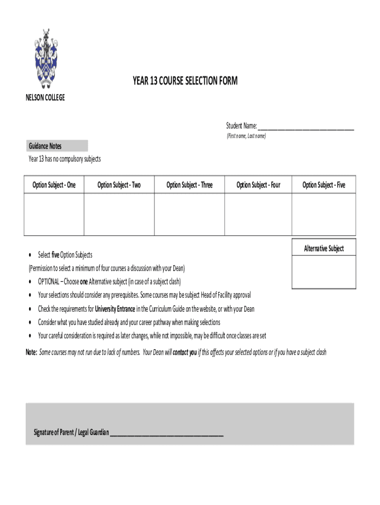YEAR 13 COURSE SELECTION FORM NELSON COLLEGE Student Name: (First name, Last name)Guidance Notes Year 13 has no compulsory subjects Option Subject Operation Subject Option Subject Preemption Subject