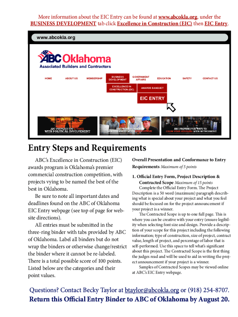 More information about the EIC Entry can be found at www.abcokla.org, under the BUSINESS DEVELOPMENT tab click Excellence in Construction (EIC) then EIC Entry. www.abcokla.orgABOUT USMEMBERSHIPBUSINESS