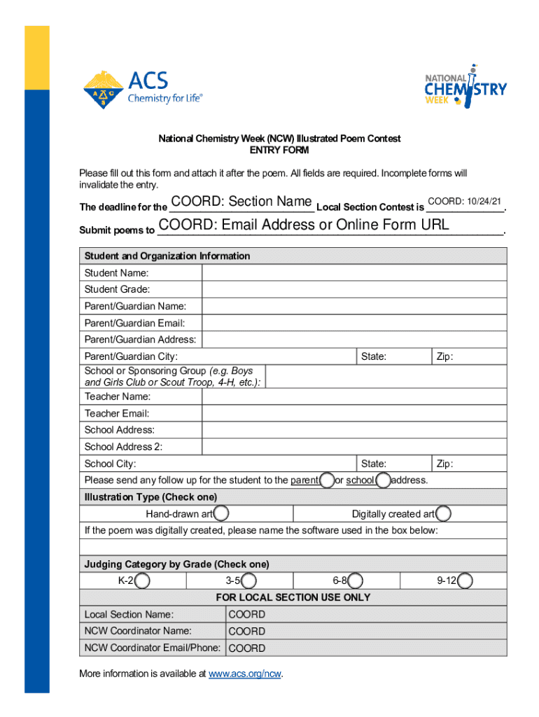 National Chemistry Week (NCW) Illustrated Poem Contest ENTRY FORM Please fill out this form and attach it after the poem. All fields are required. Incomplete forms will invalidate the entry.CHORD: