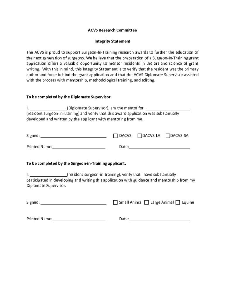 Get the free ACVS Research Committee Integrity Statement To be ...