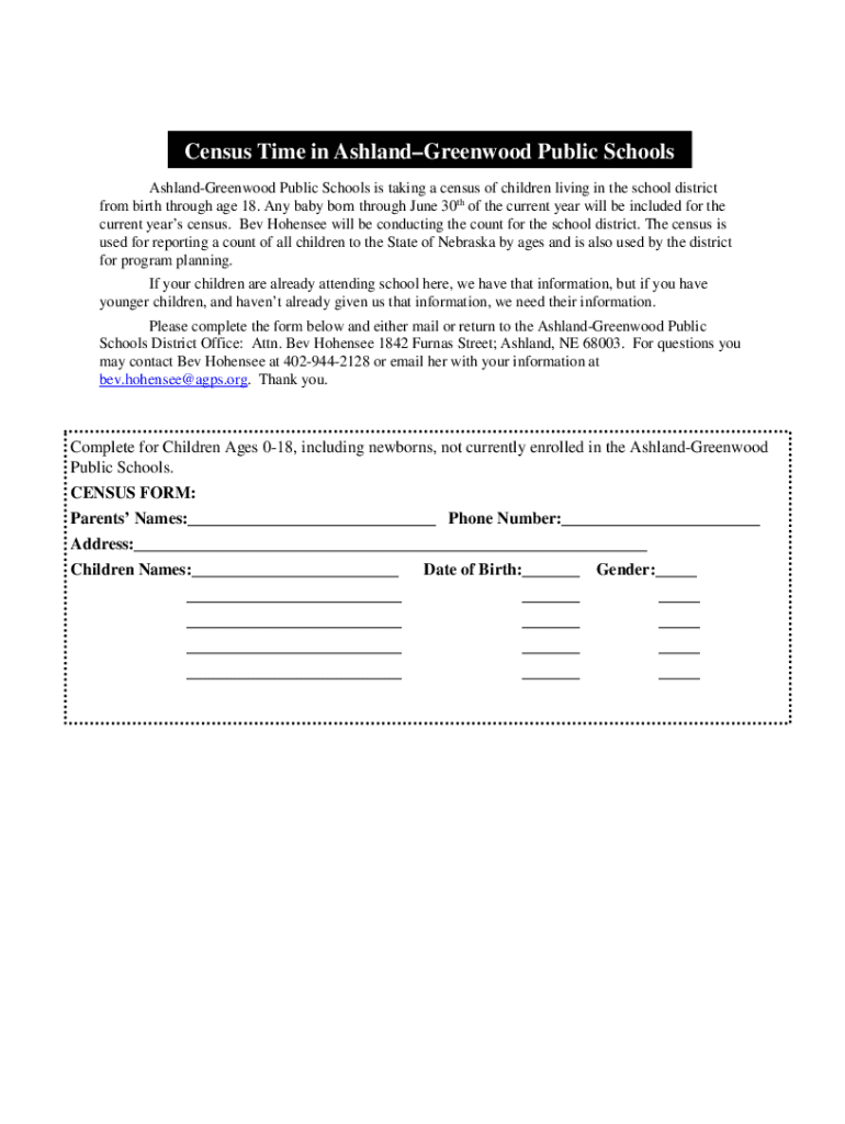 Census Time in AshlandGreenwood Public Schools AshlandGreenwood Public Schools is taking a census of children living in the school district from birth through age 18. Any baby born through June 30th