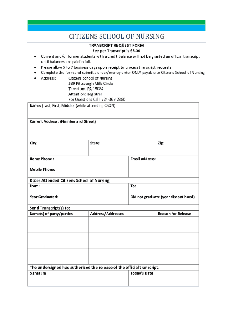 CITIZENS SCHOOL OF NURSING TRANSCRIPT REQUEST FORM Fee per Transcript is $5.00Current and/or former students with a credit balance will not be granted an official transcript until balances are paid
