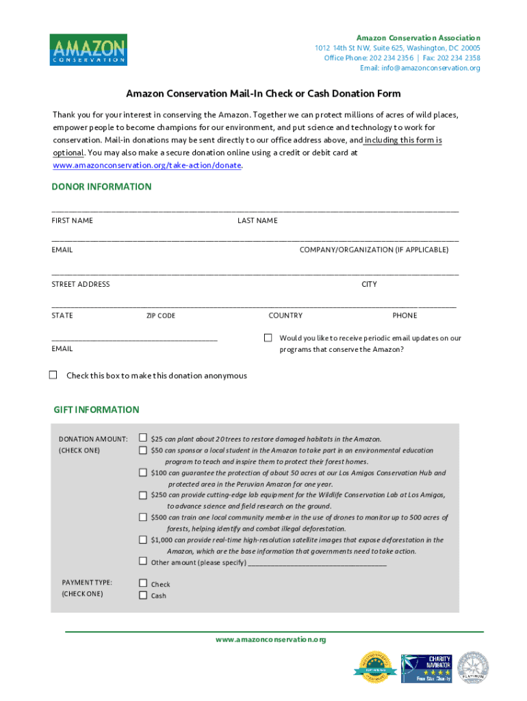 Amazon Conservation Association1012 14th St NW, Suite 625, Washington, DC 20005 Office Phone: 202 234 2356 Fax: 202 234 2358 Email: info Amazon conservation.org Amazon Conservation Mailing Check or