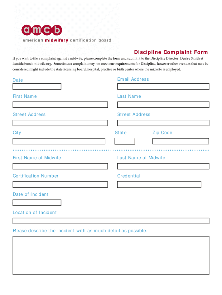 Discipline Complaint Form If you wish to file a complaint against a midwife, please complete the form and submit it to the Discipline Director, Denise Smith at dsmith@amcbmidwife.org. Sometimes a