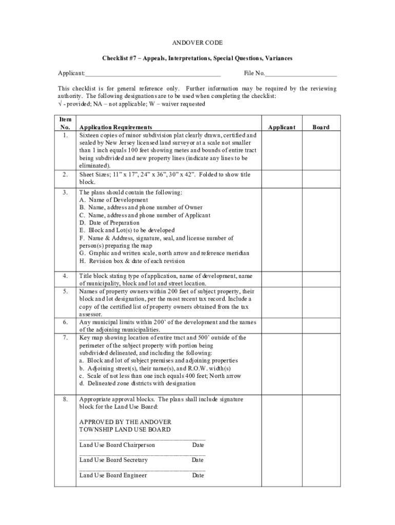 ANDOVER CODE Checklist #7 Appeals, Interpretations, Special Questions, Variances Applicant:File No. This checklist is for general reference only. Further information may be required by the reviewing