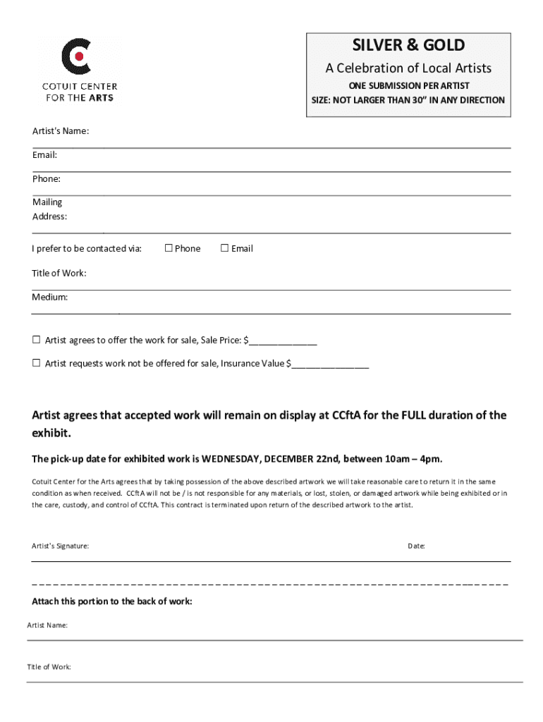 SILVER & GOLD A Celebration of Local Artists ONE SUBMISSION PER ARTIST SIZE: NOT LARGER THAN 30 IN ANY DIRECTION Artist's Name: Email: Phone: Mailing Address: I prefer to be contacted via: Phone Mistitle