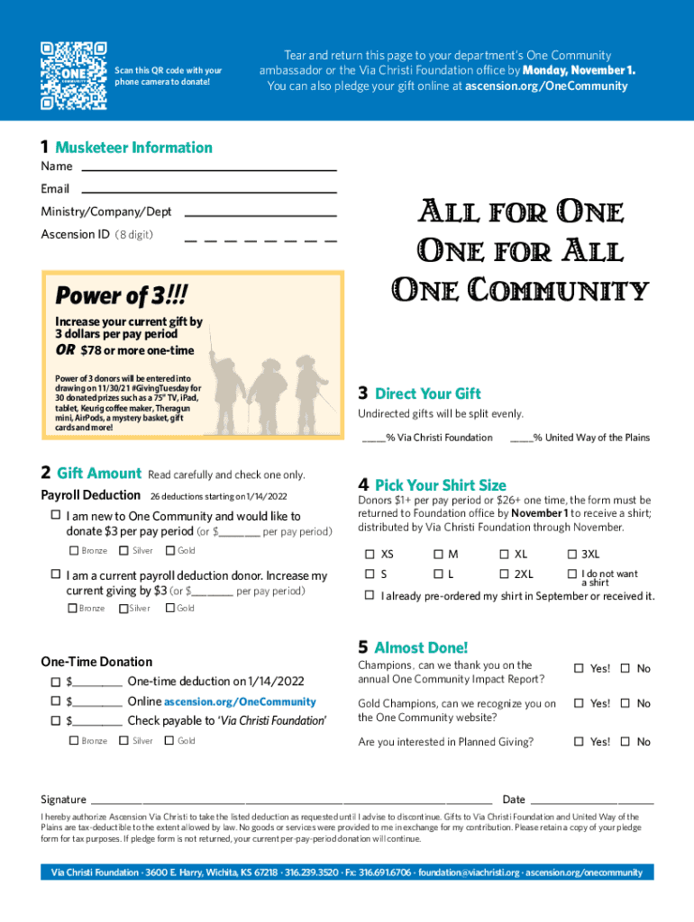 October 1 November 1 Your story. Your legacy. Give to One Community. Turn the page to see how your gift of charity can help others at Ascension Via Christi and in our community. Receive a shirt with
