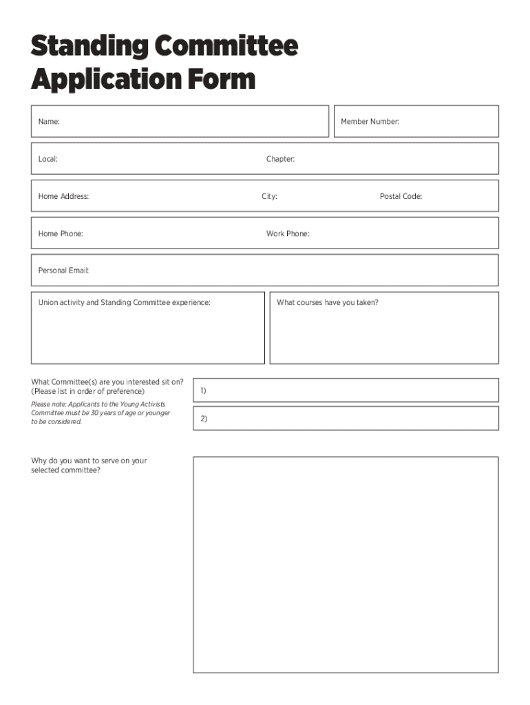 Standing Committee Application Form Name:Member Number:Local:Chapter:Home Address:City:Home Phone:Work Phone:Personal Email:Union activity and Standing Committee experience:What Committee(s) are you