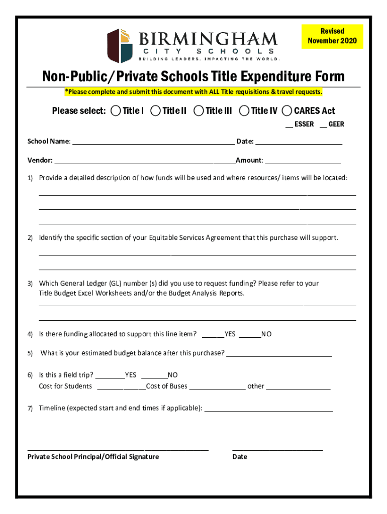 Revised November 2020NonPublic/Private Schools Title Expenditure Form *Please complete and submit this document with ALL Title requisitions & travel requests. Please select: Title I Title II Title