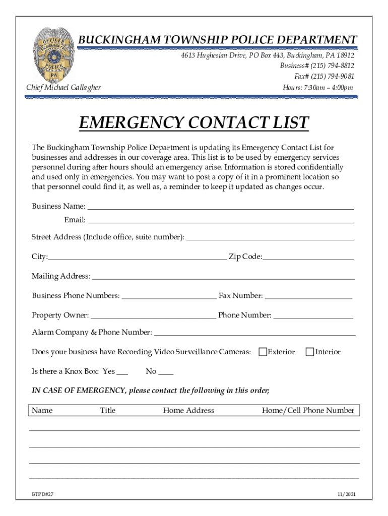 BUCKINGHAM TOWNSHIP POLICE DEPARTMENT 4613 Hughes Drive, PO Box 443, Buckingham, PA 18912 Business# (215) 7948812 Fax# (215) 7949081Chief Michael GallagherHours: 7:30am 4:00pmEMERGENCY CONTACT LIST