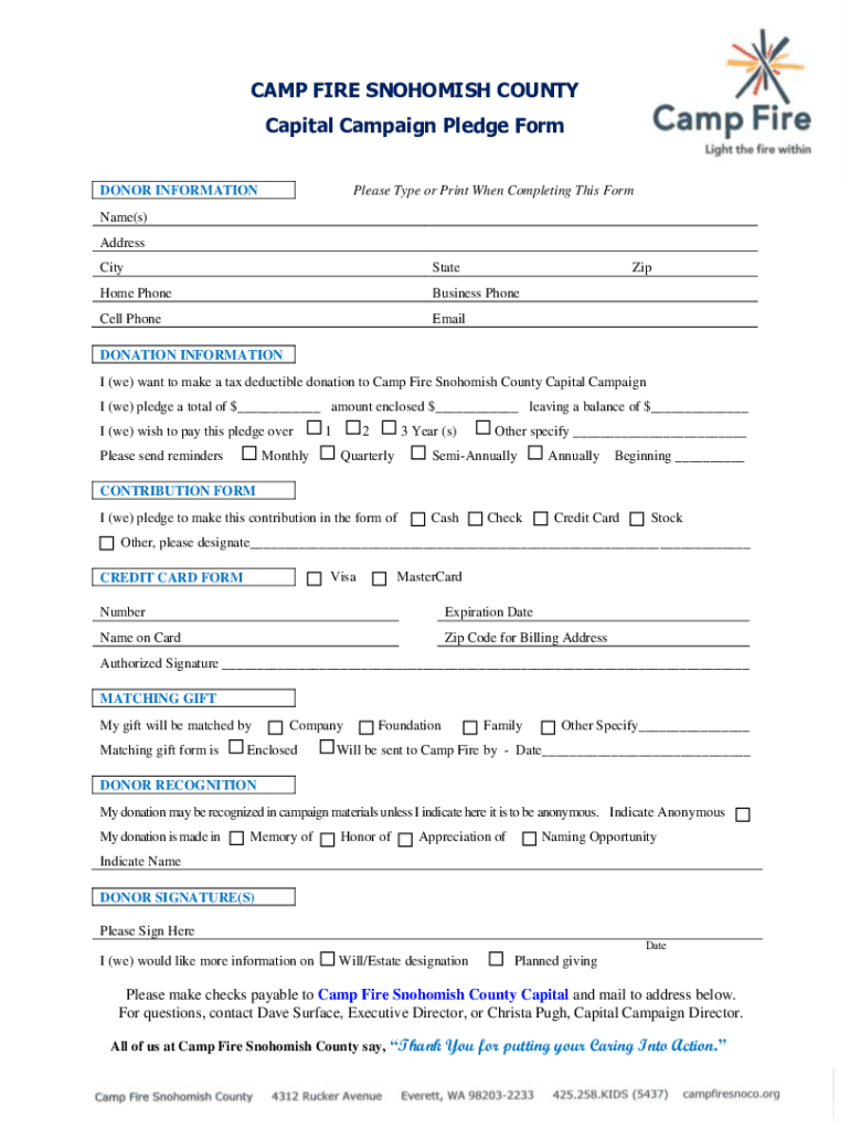 CAMP FIRE SNOHOMISH COUNTY Capital Campaign Pledge Form Please Type or Print When Completing This Foredooms INFORMATION Name(s) Address CityStateZipHome PhoneBusiness Photocell PhoneEmailDONATION