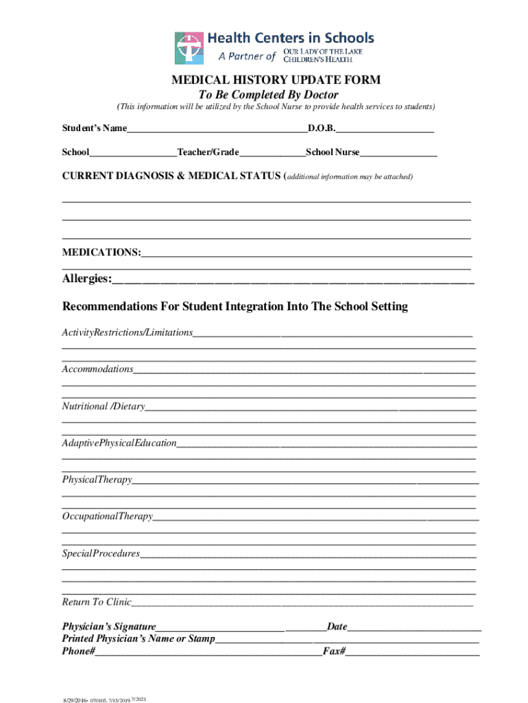 MEDICAL HISTORY UPDATE FORM To Be Completed By Doctor (This information will be utilized by the School Nurse to provide health services to students)Students Name D.O.B. School Teacher/Grade School