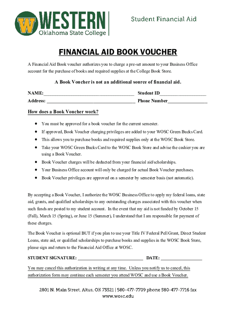 FINANCIAL AID BOOK VOUCHER A Financial Aid Book voucher authorizes you to charge a preset amount to your Business Office account for the purchase of books and required supplies at the College Book