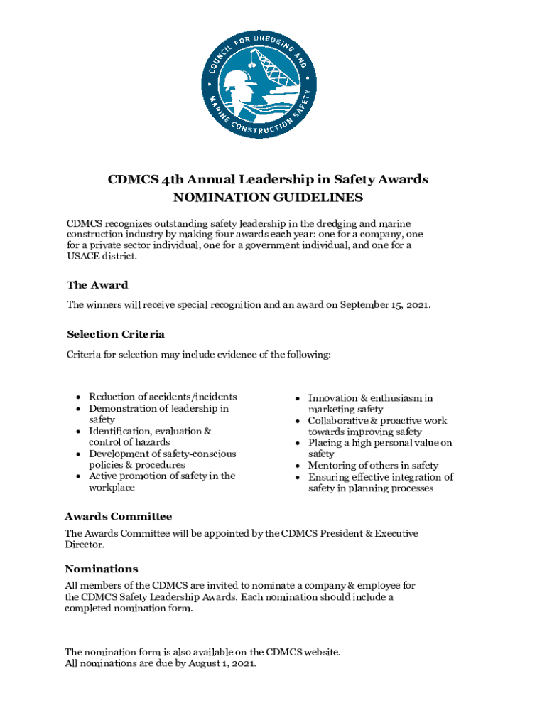 CD MCS 4th Annual Leadership in Safety Awards NOMINATION GUIDELINES CD MCS recognizes outstanding safety leadership in the dredging and marine construction industry by making four awards each year: