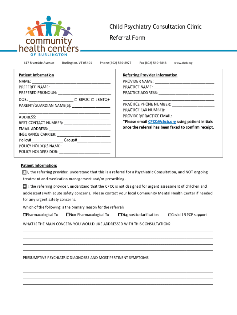 Child Psychiatry Consultation Clinic Referral Form617 Riverside Avenue Burlington, VT 05401Phone (802) 5408977Patient Information NAME: PREFERRED NAME: PREFERRED PRONOUN: DOB: BIPOC LB GTQ+ PARENT/GUARDIAN