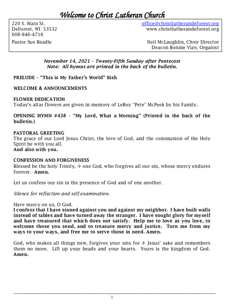 Welcome to Christ Lutheran Church 220 S. Main St. Deforest, WI 53532 6088464718office christlutherandeforest.org www.christlutherandeforest.orgPastor Sue Beadle Neil McLaughlin, Choir Director Deacon