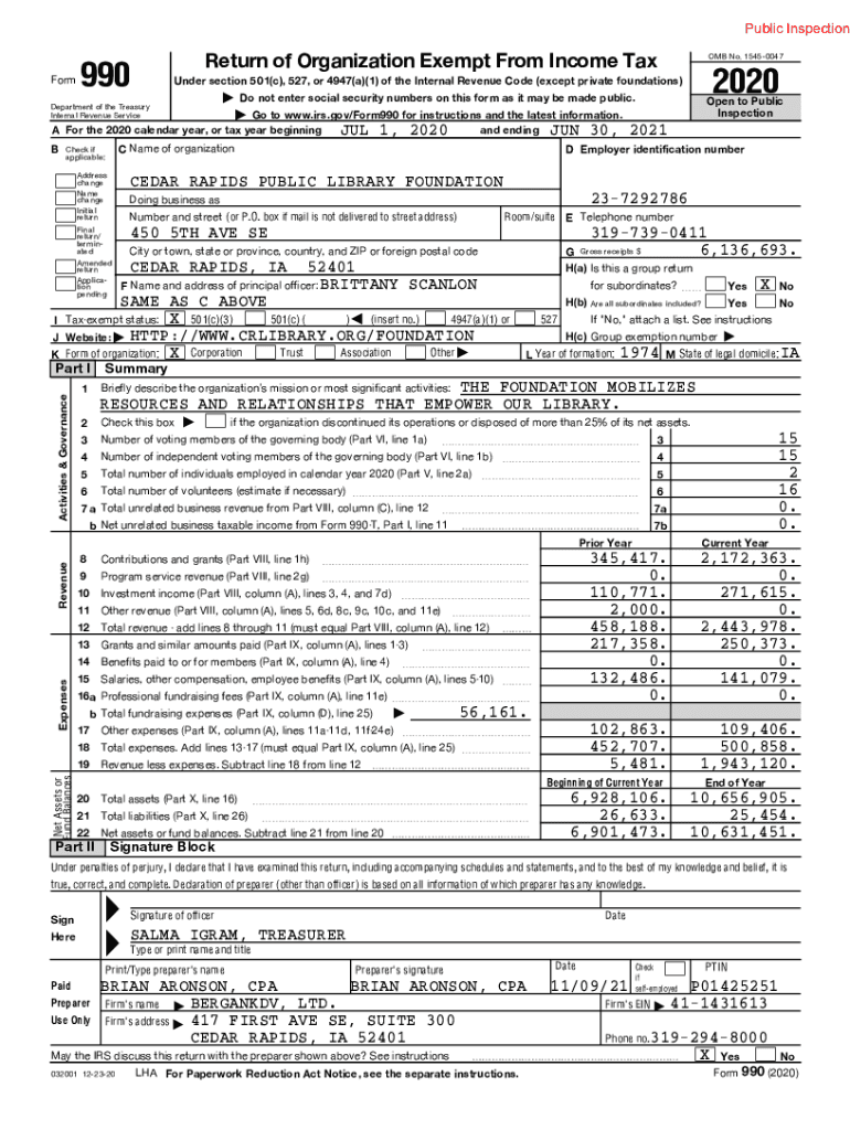 Public InspectionForm990Return of Organization Exempt From Income Tax OMB No. 15450047 Do not enter social security numbers on this form as it may be made public. Open to Public InspectionUnder section