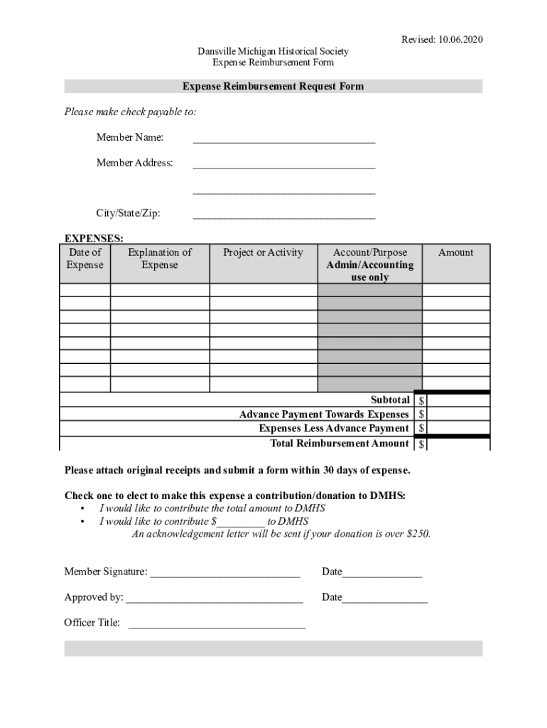Revised: 10.06.2020 Danville Michigan Historical Society Expense Reimbursement FormExpense Reimbursement Request Form Please make check payable to: Member Name: Member Address: City/State/Zip: EXPENSES: