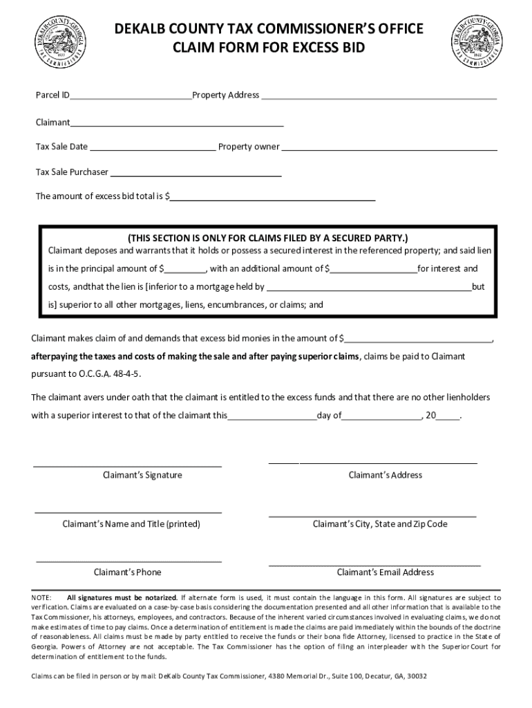 DEKALB COUNTY TAX COMMISSIONERS OFFICE CLAIM FORM FOR EXCESS BID Parcel Property AddressClaimant Tax Sale DateProperty overtax Sale Purchaser The amount of excess bid total is $(THIS SECTION IS ONLY