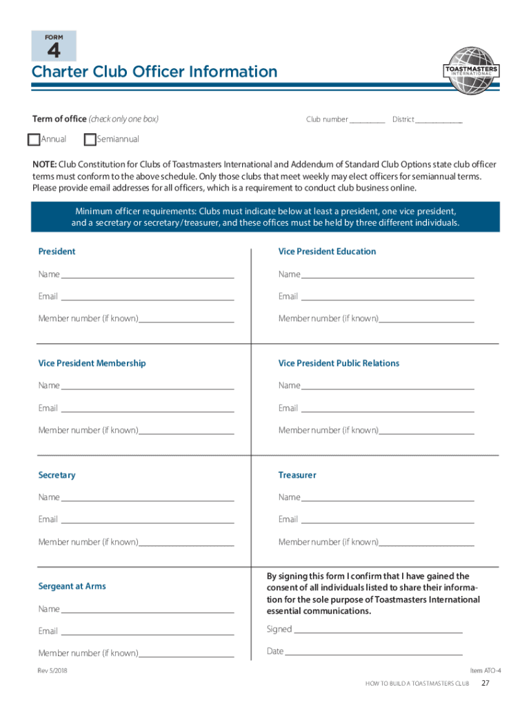 FORM4Charter Club Officer Information Term of office (check only one box)Club number District Annual Semiannual NOTE: Club Constitution for Clubs of Toastmasters International and Addendum of Standard