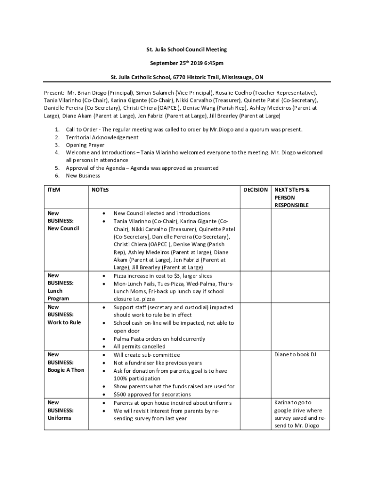 St. Julia School Council Meeting September 25th 2019 6:45pm St. Julia Catholic School, 6770 Historic Trail, Mississauga, ON Present: Mr. Brian Diego (Principal), Simon Salamis (Vice Principal), Rosalie