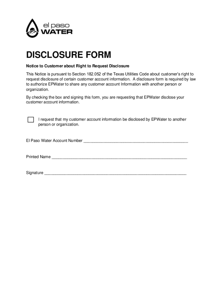 DISCLOSURE FORM Notice to Customer about Right to Request Disclosure This Notice is pursuant to Section 182.052 of the Texas Utilities Code about customers right to request disclosure of certain customer