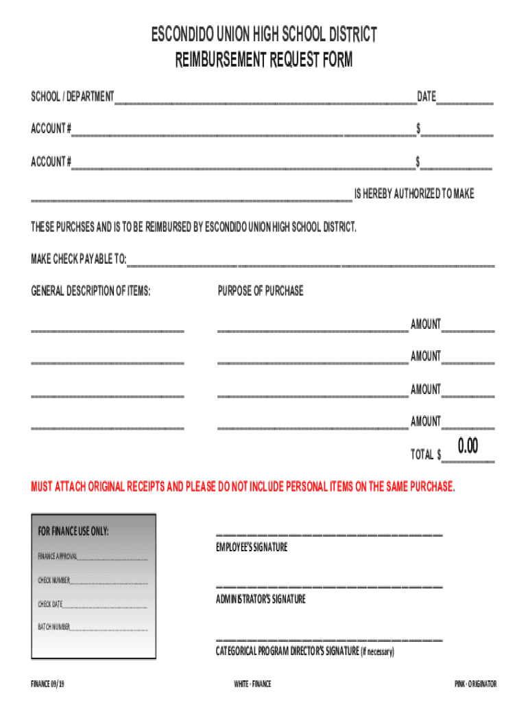 ESCONDIDO UNION HIGH SCHOOL DISTRICT REIMBURSEMENT REQUEST Formulae Preschool / DEPARTMENT DATE ACCOUNT # $ ACCOUNT # $ IS HEREBY AUTHORIZED TO MAKE THESE PURCHASES AND IS TO BE REIMBURSED BY ESCONDIDO