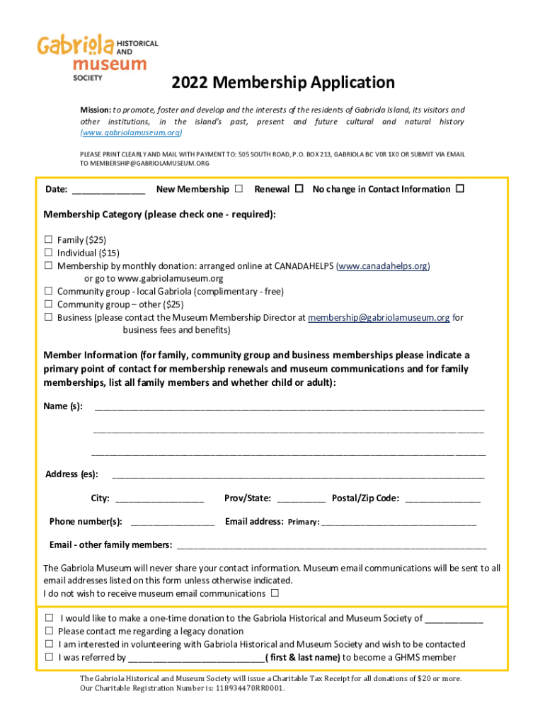 2022 Membership Application Mission: to promote, foster and develop and the interests of the residents of Gabriela Island, its visitors and other institutions, in the islands past, present and future