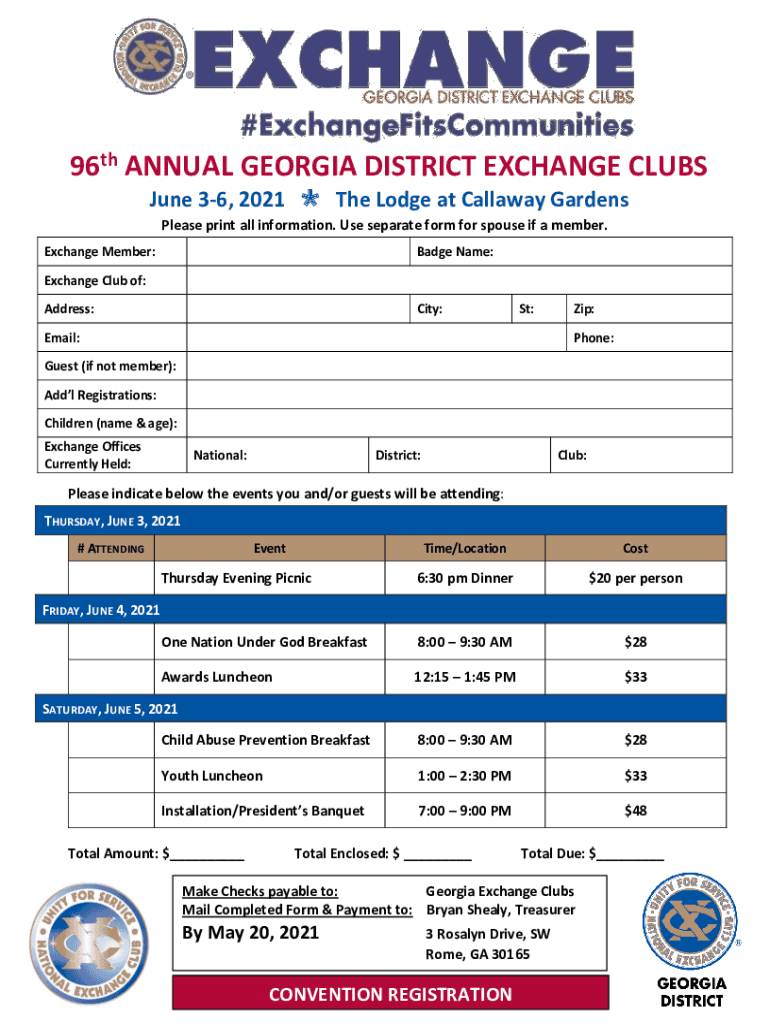 96th ANNUAL GEORGIA DISTRICT EXCHANGE CLUBS June 36, 2021, The Lodge at Callaway Gardens Please print all information. Use separate form for spouse if a member. Exchange Member:Badge Name:Exchange