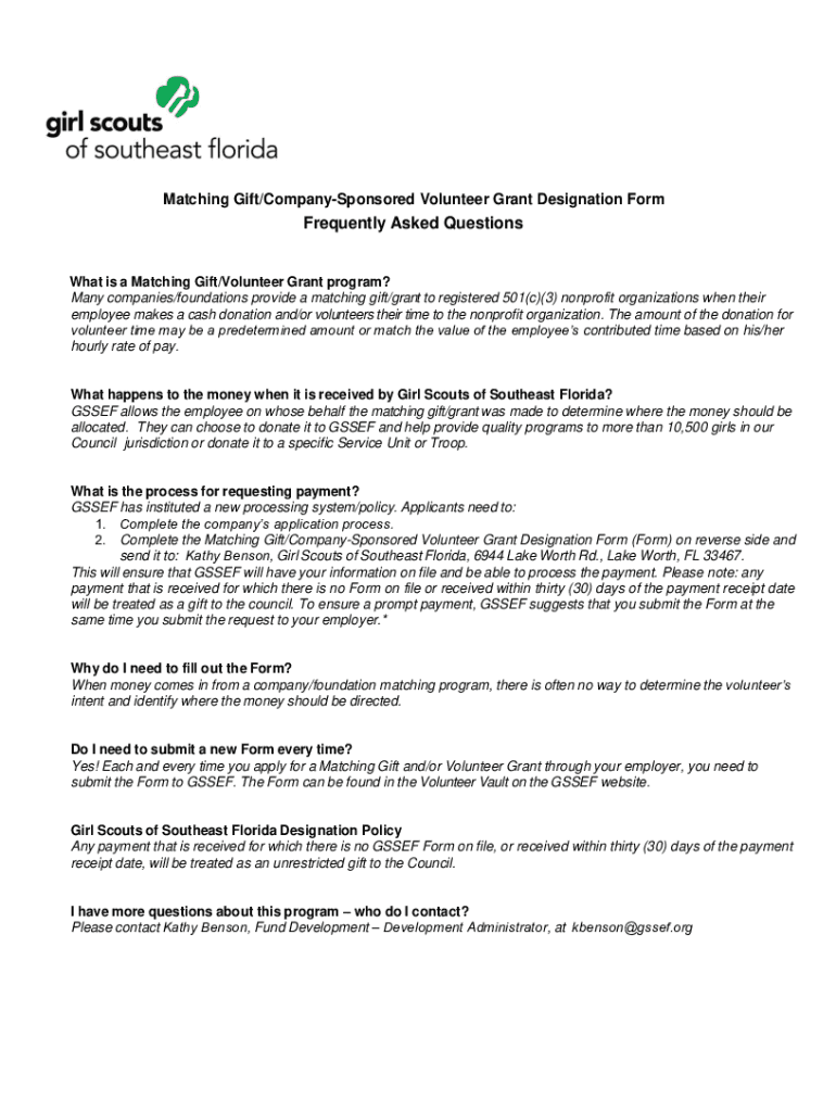 Matching Gift/CompanySponsored Volunteer Grant Designation FormFrequently Asked QuestionsWhat is a Matching Gift/Volunteer Grant program? Many companies/foundations provide a matching gift/grant to