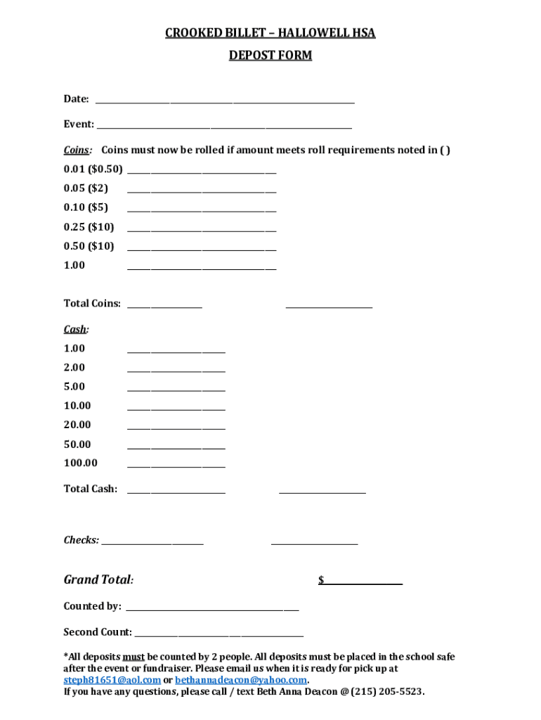 CROOKED BILLET HALLOWEEN HSA DEPOSIT FORM Date: Event: Coins: Coins must now be rolled if amount meets roll requirements noted in () 0.01 ($0.50) 0.05 ($2) 0.10 ($5) 0.25 ($10) 0.50 ($10) 1.00 Total