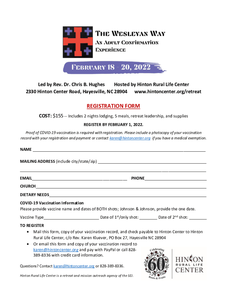 Led by Rev. Dr. Chris B. Hughes Hosted by Hinton Rural Life Center 2330 Hinton Center Road, Hayesville, NC 28904 www.hintoncenter.org/retreatREGISTRATION FORM COST: $155 Includes 2 nights lodging,
