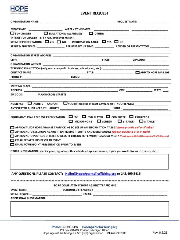 EVENT REQUEST ORGANIZATION NAME: REQUEST DATE: EVENT DATE: ALTERNATIVE DATES: FUNDRAISER EDUCATION & AWARENESS OTHER: TYPE OF FUNDRAISER (I.E. 5K run, employer match): SPEAKER PRESENTATION: YES NO