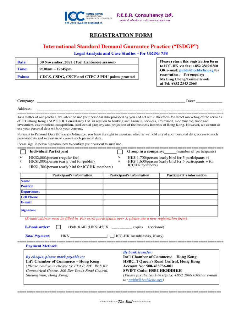 REGISTRATION FORM International Standard Demand Guarantee Practice (ISD GP) Legal Analysis and Case Studies for URDU 758 Date:30 November 2021 (Tue, Cantonese session)Time:9:30am 12:45pmPoints:CDs,